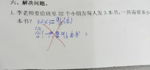 雷军前几天演讲,说“同时供家里两个孩子上大学,压力巨大”。 咱们笑笑就行了,其实这两天压力巨大的,是小学家长。 开学季,教材大改版,孩子还没嚎,父母已经焦头烂额。最先引爆家长群的是一道数学题。 “李老师要给班里32个小朋友每人发3本书,一共需要多少本书?” 孩子解题时列式:32x3=96(本) 然而老师批卷,画了个大红叉。