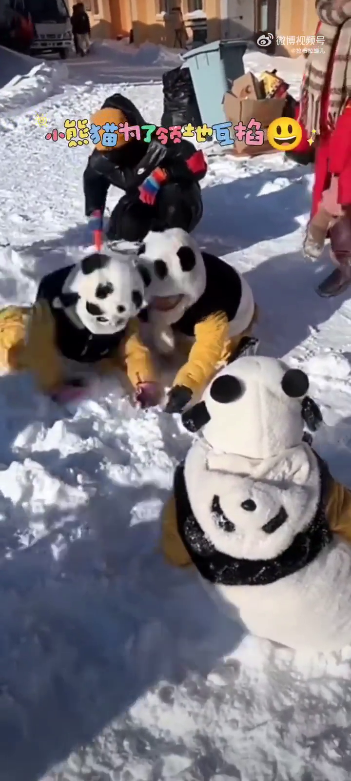 太可爱了,难怪说南方小土豆不包括川渝的,因为川渝是小暴龙啊,在哈尔滨玩雪玩着玩着就掐起来了,还穿着熊猫服