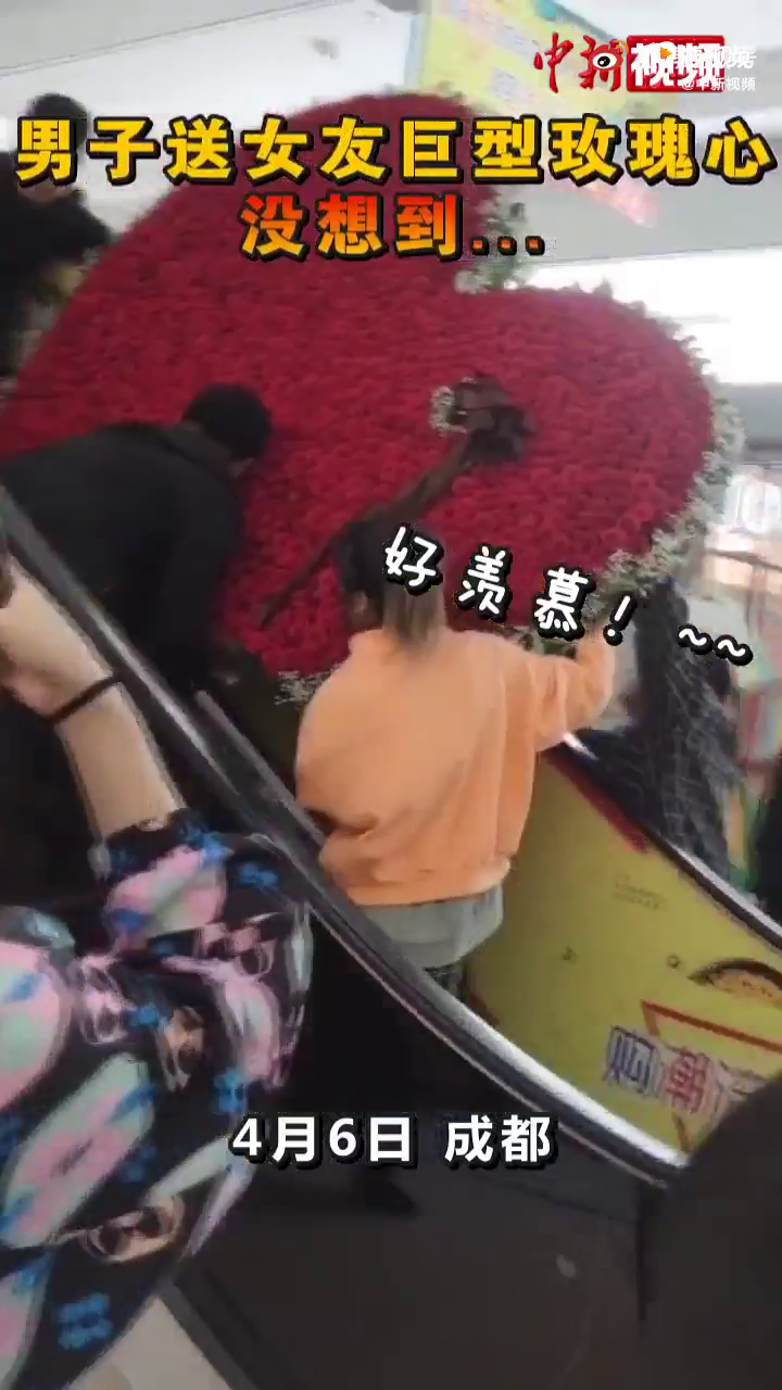 4月6日,四川成都,男子送女友巨型玫瑰心运上扶梯时碎一地 网友:我好像不羡慕了。