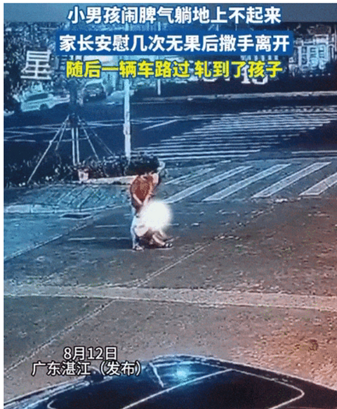 这两天,看到了一个很揪心的新闻。事情发生在8月12日晚上,广东湛江市。马路边,一个小男孩突然脾气上来了,躺在地上撒泼打滚。妈妈看孩子躺在地上,一边哄一边拉他起来。可无论妈妈如何劝说,孩子都固执地不肯起身。
