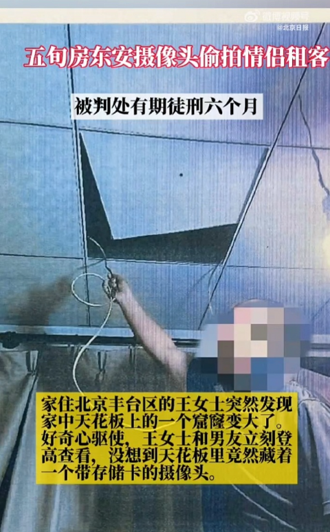 4月3日,央视《焦点访谈》公布了一则发生在北京的偷拍案件。家住北京丰台区的王女士突然发现家中天花板上的一个窟窿变大了。好奇心驱使,王女士和男友立刻登高查看,没想到天花板里竟然藏着一个带存储卡的摄像头。潜入租客房间安装摄像头的房东张某,因非法侵入住宅罪被判处有期徒刑六个月。 张某供述,租客王女士和其男友承租后,他产生了窥探他人隐私的想法,于是购买了摄像头,并用备用钥匙潜入了房间,把设备隐秘地安装在了