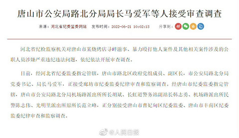 目前,经河北省纪委监委指定管辖,唐山市路北区政府党组成员、副区长,市公安局路北分局党委书记、局长马爱军,正接受廊坊市纪委监委纪律审查和监察调查。经唐山市纪委监委指定管辖,唐山市公安局路北分局机场路派出所所长胡斌、长虹道警务站副站长韩志勇、机场路派出所民警陈志伟、光明里派出所原所长范立峰,正分别接受唐山市曹妃甸区纪委监委、唐山市丰南区纪委监委纪律审查和监察调查。