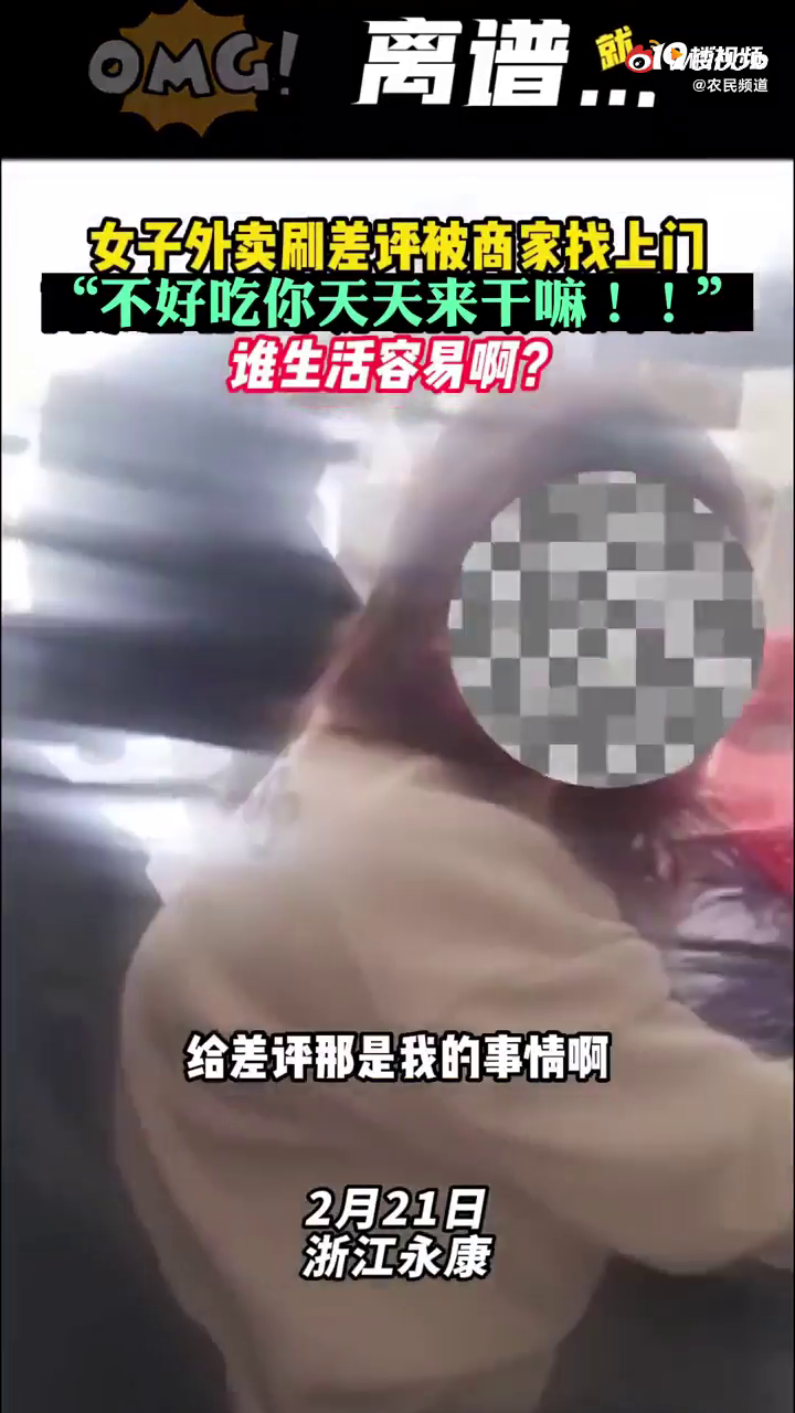 浙江金华永康。一女子点外卖连续给同一商家刷了10个差评被怒找上门。面对质问,女子回应说,给差评是自己的事情。商家怒怼:“我找你删差评是我的事情啊!不好吃你天天来干嘛?有谁生活容易啊!