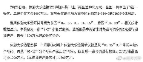 2月26日晚,重庆渝中一彩民喜中1000万大奖,据了解全国一共出了3注一等奖,都是些撒子神仙运气嘛!