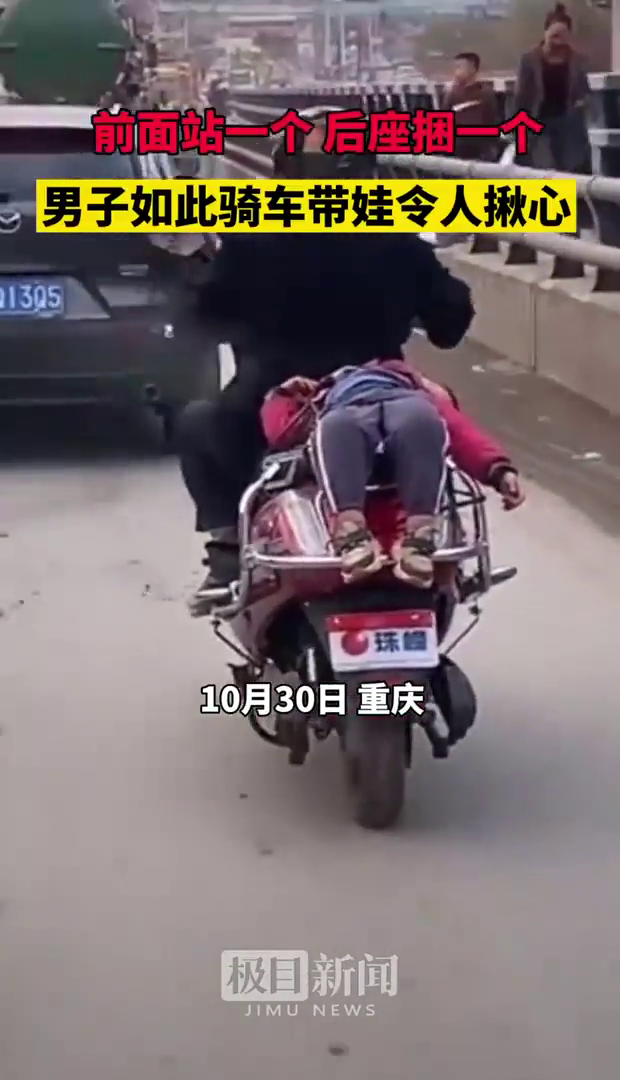 前面站一个后座捆一个,重庆一男子如此骑车带娃令人揪心