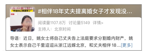 有人在婚姻里当公主,有人在婚姻里被割韭菜,人类的悲欢并不相通。 这几天,一个热搜让无数网友气得牙痒。 “相伴18年丈夫提离婚女子才发现没有财产”,这里的每个字我都认识,但放在一起却有些黑人问号脸了。