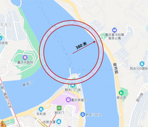 在两江交汇处修建一个内半径为380米、外半径为400米、宽20米的环形步道,连接朝天门、江北嘴、南滨路,我将其命名为“城市之环”,建成后既能将“长嘉汇大景区”彻底连通,更能成为重庆新的城市地标,岂不妙哉!本项目为全钢结构,分别在朝天门、江北嘴、南滨路按一个支架(在不影响航运的情况下在江中也可以加若干支架),然后把环形步道架上去(想象一下家里的煤气灶上的铁环),当然高度要能保证渡轮通过。