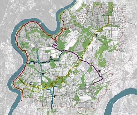 该绿道系统初期规划范围为人和、礼嘉组团,全长168公里,共有7条绿道线路,组成“两廊三轴”空间结构。以休闲为主、兼具通勤等为主要功能,可步行,也可骑行。 两廊:沿嘉陵江滨水廊道、龙凼山-照母山-园博园-中央公园山脊廊道。 三轴:九曲河-园博园绿道轴线、动步公园-照母山-北恒公园绿道轴线、欢乐谷-园博园-金山公园绿道轴线。七条线路: 1号绿道:沿嘉陵江滨江绿道,全长约20公里。 2号绿道:沿照母山-