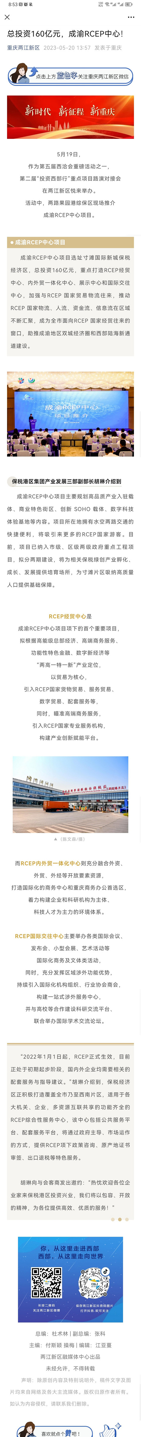 成渝RCEP中心项目 成渝RCEP中心项目选址寸滩国际新城保税经济区,总投资160亿元,重点打造RCEP经贸中心、内外贸一体化中心、展示中心和国际交往中心,加强与RCEP 国家贸易物流往来,推动RCEP 国家物流、人流、资金流、信息流在区域不断汇聚,成为全市面向RCEP 国家经贸往来的窗口,助推成渝地区双城经济圈和西部陆海新通道建设。