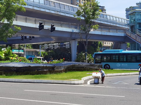 2024年8月8日午,约40度的高温环境下,年迈老者因推车无法过新南路立交人行天桥,只能横穿马路。 新南路立交人行天桥约五年前完工,后配套了电梯,夏天因高温,要保护电梯,频繁停运,导致携大物的、推车的,推轮骑的,身体不便的等多种情况不能走人行阶梯的,均难以过天桥,要么只能换个时间出门,要么得走很远的路过人行横道,要么就是横穿马路了,很多时候,横穿马路变得便捷, 人行天桥配套电梯算是一个进步了,还有