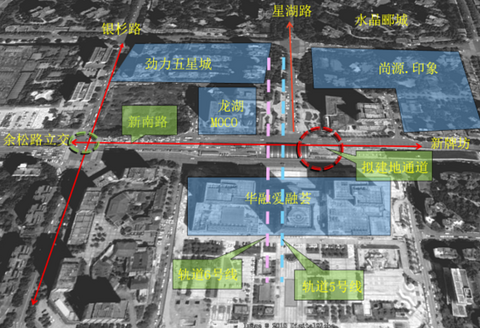 4月15日, 江小妹从两江新区住房城乡建委打探到, 新南路华融广场人行过街设施项目 正加快建设,力争今年内完工投用。 项目建成投用后, 将实现人车分流, 预计缩短通行时间至2分钟内, 日均服务数万人次。 项目位置图。