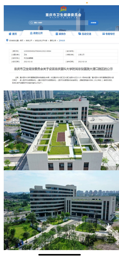 据大渡口区三甲医院建设专项工作组消息,市卫生健康委近日正式批复,同意设置重庆医科大学附属康复医院(大渡口院区),这标志着大渡口区三级医院建设取得实质性进展。据了解,此次批复的机构地址位于大渡口组团H分区15-15-3号宗地,机构类别为康复医院,机构级别为三级,床位数650张,诊疗科目包括康复医学科(关节康复科、神经康复科、脊髓损伤康复科等)、内科、外科、重症医学科、急诊医学科、预防保健科、妇产科、