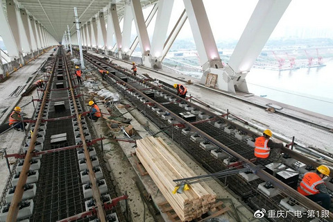 3月3日,随着最后一对钢轨精准落位,由中铁二十五局承建的重庆轨道交通18号线轨道工程圆满完成重庆白居寺长江大桥铺轨任务,标志着这座世界最大跨径公轨两用钢桁梁斜拉桥实现轨通。
