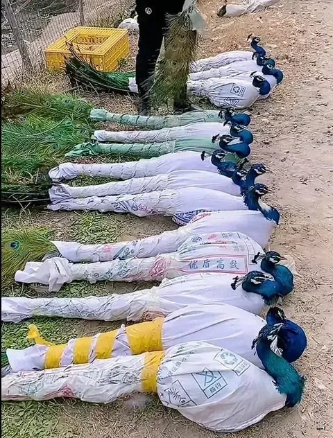 远看还以为是一排大葱近看居然是打包的孔雀这是怕路上开屏?
