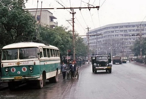 这是当时2路电车的起点站,图中这辆电车是比较老的车型,我都没有见过,背后就是沙坪坝三角碑,那时候公路上的车不是很多。