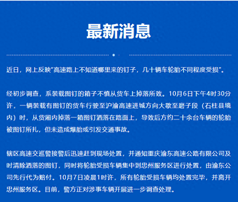 重庆高速通报“高速路上多辆车轮胎扎满图钉”:约20余台车辆轮胎被扎,系图钉从货车上掉落所致近日,网上反映“高速路上不知道哪里来的钉子,几十辆车轮胎不同程度受损”。 经初步调查,系装载图钉的箱子不慎从货车上掉落所致。10月6日下午4时30分许,一辆装载有图钉的货车行驶至沪渝高速进城方向大歇至磨子段(石柱县境内)时,从货厢内掉落一箱图钉洒落在路面上,导致后方约二十余台车辆的轮胎被图钉所扎,但未造成爆胎