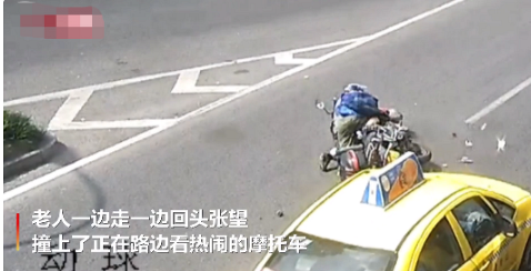 近日,重庆九龙坡发生了一起交通事故。一辆摩托车为了礼让拄拐杖过马路的老人,竟然被后方的出租车追尾了。出租车身后的一辆摩托车也因为躲闪不及,直接撞了上去。而路过的老人急急忙忙地走过去之后,在回头张望时还撞上了路边看热闹的摩托。 来源:中国网