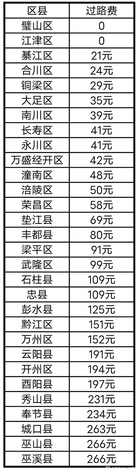 重庆各个区、县去趟主城区真的不便宜啊!过路费真心不低啊