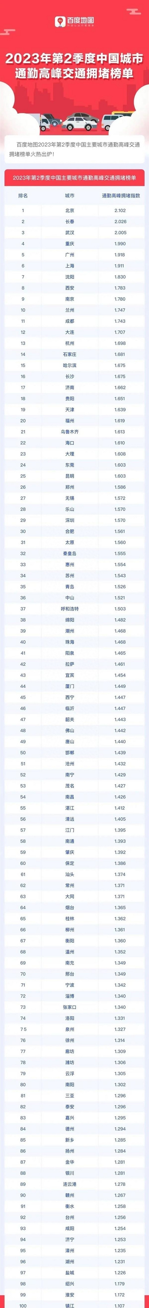 中国最新城市拥堵排名:北京长春武汉前三日前,百度地图与清华大学数据科学研究院交通大数据研究中心、重庆大学公共管理学院、北京交通发展研究院联合发布《2023年第二季度中国城市交通报告》(以下简称《报告》),描绘了全国100个主要城市。多样性。 报告显示北京继续位居通勤拥堵榜首,长春重返前三,兰州首次进入前十。与2023年第一季度相比,第二季度最受欢迎的100个城市中近70%的通勤拥堵指数有所上升。此