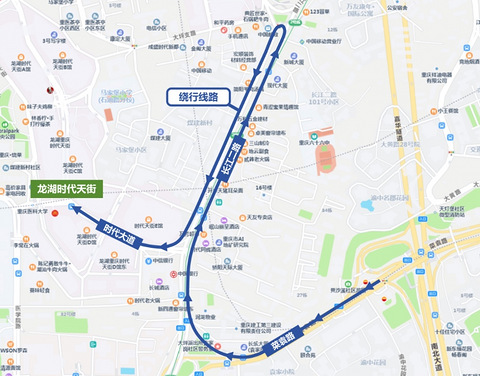 因长江二路菜袁路路口车辆变道交织影响长江二路通行不畅,为规范该路口行车秩序,自2025年5月10日起菜袁路右转车辆禁止变道往龙湖重庆时代天街方向行驶,往龙湖重庆时代天街方向车辆请靠右侧直行至大坪环道掉头。