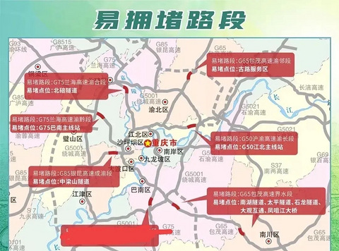 五一还没来,就有很多人预测,这个五一这些地方容易堵车五一还没来,就有很多人预测,这个五一会火爆的不得了,理由是大家在家里憋了一年多,是该出来耍耍啦。如果预言成真,那么,重庆进出城的那几条高速,岂不是要都城停车场乎?你们打算几点钟出发呢? 话虽这么说,我们来看一看,重庆进出城最容易堵车的地方吧,如下图所示:北碚隧道、G50长寿方向、中梁山隧道等。 另外,不知道这个五一,会不会将千厮门大桥封闭起来让游
