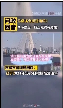 相信前段时间很多走内环的小伙伴着堵车堵安逸了,有时甚至要堵上几个小时,特别马桑溪大桥单道 通行更堵,不少车辆选择在走龙洲湾隧道下内环,导致重庆高职城都堵车。 近日重庆市城管局回应,内环一期整治工程已经结束,从南环立交至凤中立交段已经于2021年1月5日恢复通车,现在应该不用担心 堵车了。 走内环的小伙伴们,现在是否还堵车呢