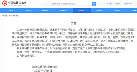 渝万高铁是渝东北片区与主城目前唯一的高铁通道,对于沿线万州开州等区县至关重要。近日,渝万铁路有限责任公司在其官网发布的《公告》显示从今年5月20日开始,渝万城际铁路要涨价了,涨幅为20%,渝万城际铁路全长247公里,二等座票价从0.4元每公里,上涨至0.47元~0.48元每公里。