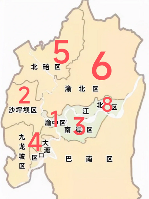 看了一下百科和地图,再按照自己的观察 发现每个区都有一个数字开头特别多的公交车 我非常确定的就是北碚区的“5”,渝北区的“6” 渝中区的“1”,南岸区的“3”,沙坪坝区的“2” 大渡口区、九龙坡区、江北区和巴南区我就不是特别确定了,因为我去得比较少或者没有观察出什么规律,因为有许多跨区的公交车,也有许多有意思的数字公交车,比如520,555,666,888 “9”开头的公交车在主城乡镇运行得比较多