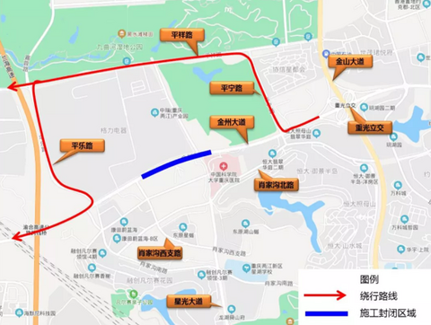 照母山走金州大道、星光大道一线 出行的朋友们注意了 ▼这一线的交通路线将有所变化这一线的交通路线将有所变化这一线的交通路线将有所变化 一、交通限制时间2021年5月15日—2022年9月7日 二、交通限制措施金州大道肖家沟西支路至平和路段双向封闭施工;▲.金州大道平宁路至平和路段仅限重庆市人民医院及中石化加油站进出使用;▲.部分道路调整为单向交通:平宁路(肖家沟北路至金州大道段)、肖家沟西支路(肖