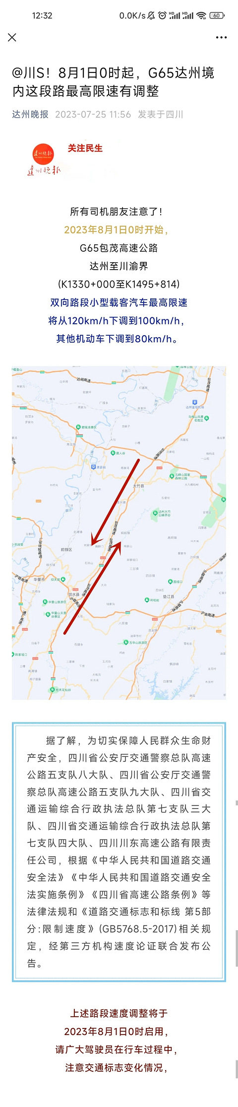 这是为什么?包茂高速等于现在四川境内全线限速100了! 这真的不是一个好消息! 2023年8月1日0时开始,G65包茂高速公路达州至川渝界(K1330+000至K1495+814)双向路段小型载客汽车最高限速将从120km/h下调到100km/h,其他机动车下调到80km/h。 去往重庆的高速限速调低,成都方向没有听说,是怕跟重庆跑了吗?