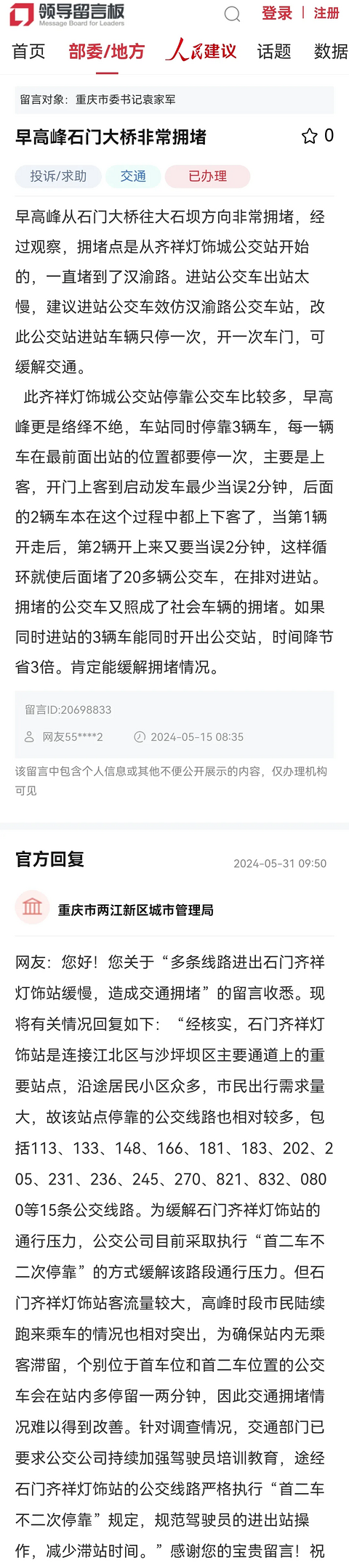 重庆市两江新区城市管理局就“早高峰石门大桥非常拥堵”回复