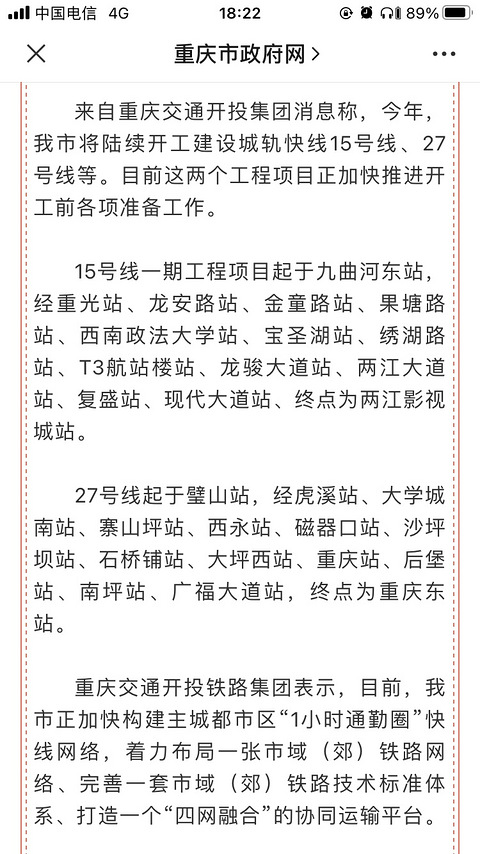 之前发布的通知都是关于15号线一期建设,一共14个站。前几天重庆政府网发布又是全线建设。2021年3月10日重庆市政府办公厅公开发布了《关于做好2021年市级重大项目实施有关工作的通知》内容:轨道交通15号线由西向东联络了沙坪坝区、两江新区和渝北区,串联了科学城铁路枢纽、重庆江北国际机场、高铁复盛站三大交通枢纽,线路全长66.8公里,设车站25座。2021年开工建设,预计2026年建设完工。这什么
