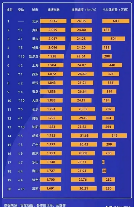 2021第二季度各城市通勤高峰交通拥挤排名,重庆第3,名次下降一位。 西安汽车保有量504万辆,拥堵指数2.057,实际速度每小时24.28千米,拥堵指数全国第3。