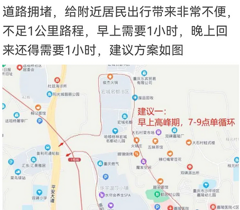 有网友提出,沙坪坝双碑片区早晚高峰道路十分拥堵,较影响周边居民出行,不足1公里路程,早上需要1小时,晚上回来还得需要1小时,建议早晚高峰采用潮汐向单循环的方式组织交通,缓解拥堵。 想法虽好,但存在诸多问题。 一是交通单向组织后,所有反方向车辆均需进入平安大道(即原212国道)后,短距离上下交织一次,无疑会加剧平安大道相关路段和转换节点的拥堵,实际同样会影响单循环运行效率。 二是潮汐向单循环组织交通