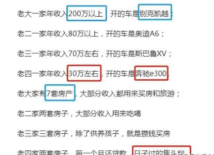 在群里看到的说老大年入200万,七套全款房 ,开10万的别克凯越;老二年入80万,两套房,开40多万的奥迪A6;老四年入30万,两套还贷房,开50多万的奔驰E300。如果三个人同时开车回村,哪个人会被高看一眼? 毋庸置疑,开“大奔”的老四和“四个圈”的老二,绝对是亲朋好友的座上宾;反观开“三个盾牌”的老大,会成为大家眼里的笑柄。一辆车的距离,见证人情冷暖,这就是赤裸裸的现实。论存款和幸福度,老大是