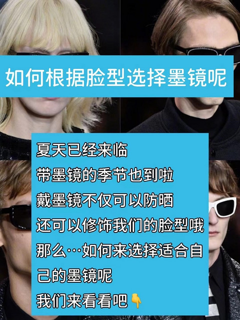 不同脸型如何选择墨镜呢脸型分别标准脸型和非标准脸型。非标准脸型:圆形脸、方形脸、正三角形脸、长形脸、菱形脸标准脸型:椭圆形脸、倒三角行脸我们调整的原理就是不标准脸型往标准脸型调整,那么怎么让每一种脸型更加的靠近椭圆形脸或瓜子脸呢?有一下3种方法1、脸型长宽与墨镜长款反向弥补关系意思就是说脸短就选择纵向拉长的墨镜,脸长就选横向拉宽墨镜。拉长和拉宽只针对圆脸、正方形脸和长脸,其他脸型不需要考虑长短的问