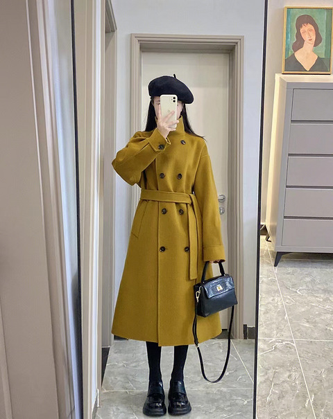 这件芥末绿立领大衣颜色好特别,穿上好显白啊!