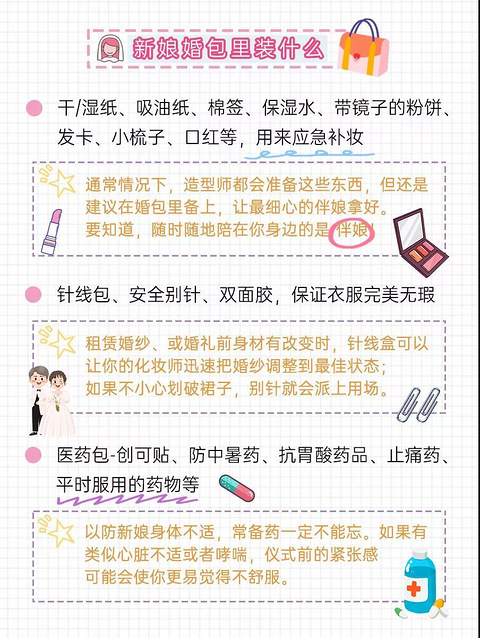 最近经常能看到“毛里毛躁”的准新娘,临近婚期还有一个月、一星期…都不知道自己该带哪些东西。 其实,新娘随身携带的包包不只是装红包用的,它还有更重要的角色——「新娘应急包」。 今天,给大家罗列一张婚礼工具应急清单,办完婚礼才知道这些15件小东西必须带!