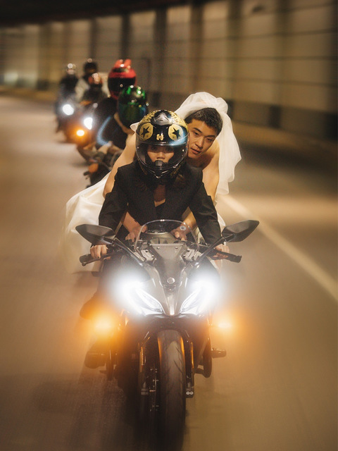 最酷的婚礼,新娘骑车机车,穿着西服,去迎接新郎