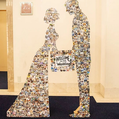 把自己和对象生命里重要的照片拼在一起,形成一个人形立牌,可以是两个人的合照,也可以是和宾客挚友的合照,把它拼成两个人在一起的欢迎牌,用于放在迎宾区,一定人气爆棚