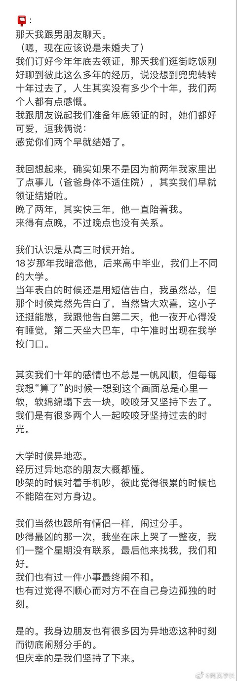 来自网友的分享,很喜欢里面的一段话,分享给大家“爱是相互的。 这句话其实贯穿着我们相处的这么多年。 这大概也是我们兜兜转转,却也没真正放弃过这段感情的原因。 18岁喜欢的人,28岁还在我身边。 愿我们,也愿所有恋人——未来坦途,爱永不消退。” ???