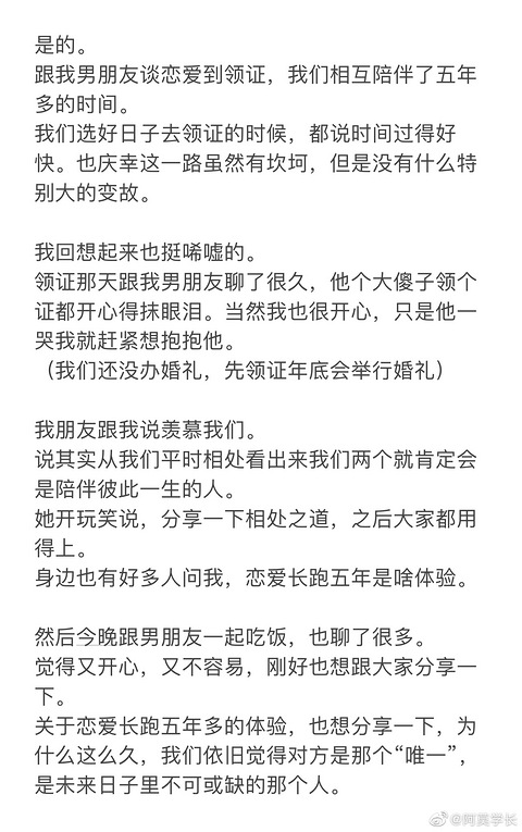 是足够多的爱,是相互偏爱和相互付出,使我们经过了五年时间还陪伴在彼此身边。 这是用漫长时光等来的幸运,之所以有这样的幸运,也是因为我们彼此用心。 希望大家在遇到值得的人时,勇敢去爱,也应当去爱。?