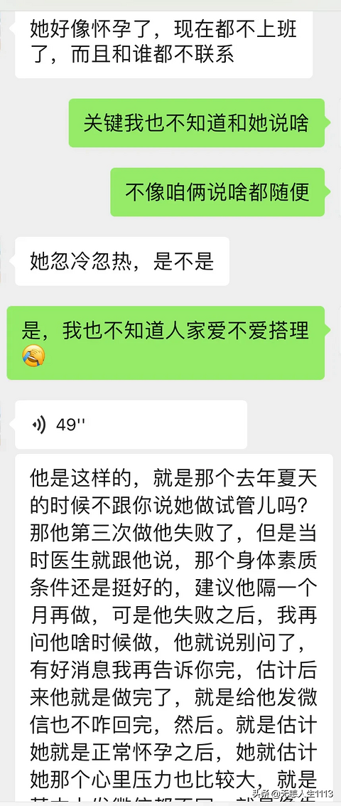 我的一个女同事41岁,一次宫外,三次试管失败,第四次试管才成功,小心翼翼守护,为了这个来之不易的孩子,曾经的职业女性现在连工作都不在乎了。谁能想到当初她极其讨厌孩子并坚决不要,甚至在部门举行年会时听说员工可以带孩子而极力反对,嫌孩子烦,太闹挺,导致和我一样只有妈妈一个人带孩子的同事都没参加上。有年龄大的姐姐劝她趁年轻早点儿生,她说人家多管闲事。平时我们几个年龄相仿的会在工作时约着去茶歇间休息一会儿