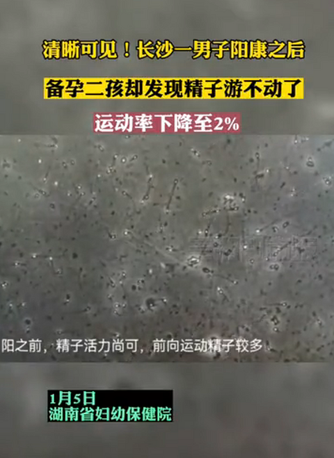 三湘都市报·新湖南客户端1月5日讯(全媒体记者 李琪 通讯员 范烺 胡嘉琪 王中伟 实习生 刘杰 视频 刘文) 近期,一对夫妻“阳康”之后进行孕前检查,丈夫精子质量下降明显,这则新闻冲上了热搜。 同样,在湖南省妇幼保健院生殖医学中心门诊,40岁的张先生也面临“阳过后精子游不动”的窘境。张先生在感染新冠前,便积极备孕二孩,检查精子的前向运动率尚可。 日前,他感染新冠转阴2天后迫不及待复查,却发现精子