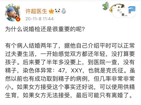 婚检有多重要?看一下医生分享的一些临床案例应该就明白了。 生育前评估生育力,做到心中有数。没有问题就正常备孕,发现问题尽快处理,避免延误病情。 另外,如果有梅毒、艾滋等杏传播疾病,婚检时的检查也可以早发现,以免导致不必要的健康危害。