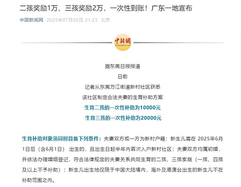 二孩奖励1万、三孩奖励2万,一次性到账!广东一地宣布