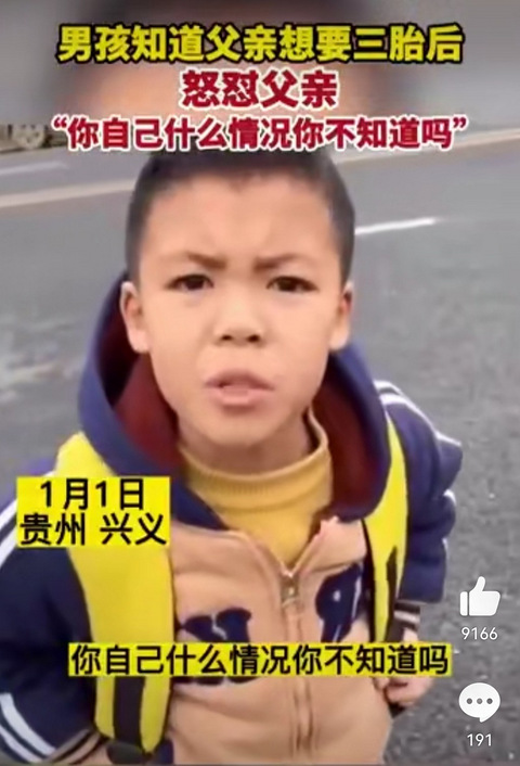 近日,贵州兴义。男孩知道父亲想要三胎后,怒怼父亲:“你自己什么情况你不知道吗?连你的零花钱都是用我的压岁钱。你怎么想的?一天天我上学就够累了,你能不能让我少操点心,真的是。”