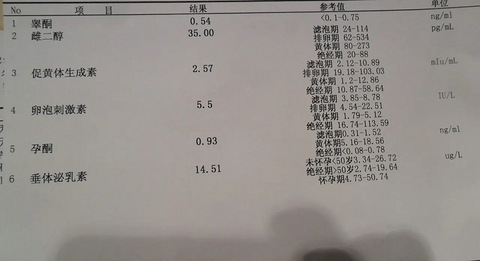由于大姨妈一直不准时,有时候40天或者50天来一次,再加上生化过两次,于是在月经期间第三天今去妇幼做了性激素测试,自行百度了性激素测试的六项是哪六项,但今天拿到结果发现里面没有孕酮这一项,医生给我加了另外两项,检测结果是泌乳素稍微高了一点,医生喊我之后去复查就行,因为有很多外在因素导致泌乳素的偏差,医生还说其他都正常的,我问那都正常为什么还一直月经不调,她喊我后续再检查宫腔,回到家里我仔细研究了下
