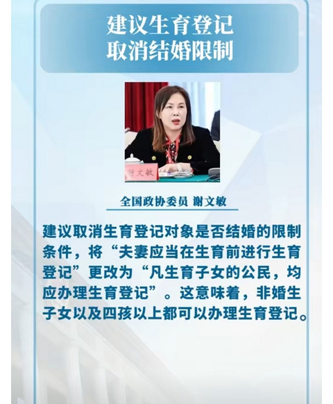 近日,全国政协委员谢文敏接受@中国新闻周刊 采访时表示,目前,我国现行生育登记取消结婚限制已经部分地区施行,但在全国范围内仍然没有得到完全施行。导致生育保险的各项待遇仅仅服务于生育登记的人群,未进行登记的人群无法享受生育政策。谢文敏建议,取消生育登记对象是否结婚的限制条件,将“夫妻应当在生育前进行生育登记”更改为“凡生育子女的公民,均应办理生育登记”。这意味着,非婚生子女以及四孩以上都可以办理生育