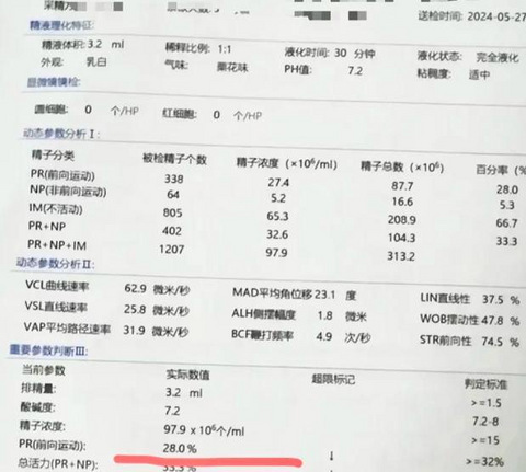 这位朋友工作非常辛苦,井下工作,检查精子质量其他还好,主要轻度弱精,前向活力28%。畸形达标95%。根据舌苔以及工作性质,精子报告单指标调理 调理秘诀:6月中旬开始吃我搭配的基础款套餐,这个基础压力小 负担轻,适合轻度少弱精人群。学习护理睾丸,忌口,只做针对生殖系统运动。 其他大运动都不要做,减少消耗。因为本身工作很辛苦,消耗大,这种不需要再去跑步或者打球等。只做针对睾丸血液循环的运动,每天坚持